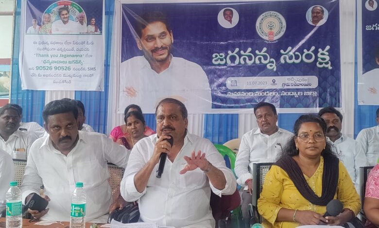 ముఖ్యమంత్రి వైయస్ జగన్మోహన్ రెడ్డి గొప్ప ఆలోచనతో రాష్ట్రం మొత్తం ప్రతిష్టాత్మకంగా నిర్వహిస్తున్న జగనన్న సురక్ష కార్యక్రమం ద్వారా రాష్ట్ర ప్రభుత్వం ప్రజలకు మరింత చేరువవుతుందని శ్రీశైలం ఎమ్మెల్యే శిల్పా చక్రపాణిరెడ్డి అన్నారు. మంగళవారం మహానంది మండల పరిధిలోని అబ్బీపురం గ్రామంలో జగనన్న సురక్ష కార్యక్రమం నిర్వహించారు. ఈ కార్యక్రమానికి ముఖ్య అతిధిగా విచ్చేసిన సందర్బంగా ఆయన మాట్లాడుతూ ఈ కార్యక్రమం ద్వారా అర్హత కలిగిన వారికి 11 రకాల ధ్రువపత్రాలను ప్రభుత్వ యంత్రాంగమే మీ దగ్గరికి చేరుస్తుందని ఇలాంటి గొప్ప అవకాశాన్ని ప్రజలు సద్వినియోగం చేసుకోవాలని కోరారు. గతంలో పాలించిన ప్రభుత్వాలలో ఏదైనా దృవపత్రం కావాలంటే మండల కార్యాలయాల చుట్టూ రోజులు తరబడి తిరిగే వారని జగన్ మోహన్ రెడ్డి ముఖ్యమంత్రి అయ్యాక సచివాలయ వ్యవస్థ, గ్రామ వాలంటీర్లను నియమించి ప్రజలకు ప్రభుత్వ పాలన దగ్గర చేశారని అన్నారు.అంతే కాకుండా అర్హులకు సంక్షేమ పథకాలు నేరుగా వారి బ్యాంకు ఖాతాలలో జమ చేస్తూ అవినీతి తావులేకుండా చర్యలు తీసుకోవడం జరిగిందన్నారు. ఐదు వేలు జీతం కన్నా గౌరవం ముఖ్యమని పని చేస్తున్న వాలంటీర్ల మీద పవన్ దిగజారుడు వ్యాఖ్యలు చేయడాన్ని తీవ్రంగా ఖండిస్తున్నానని అన్నారు.కరోనా లాక్ డౌన్ సమయంలో ముందుండి ప్రజలకు అన్ని రకాలుగా సేవలు అందించిన ఘనత వాలంటీర్లదని ఎమ్మెల్యే తెలిపారు. గడప గడపకు మన ప్రభుత్వం కార్యక్రమం శ్రీశైలం నియోజకవర్గంలో 104 రోజులు నిర్వహిస్తే ఎక్కడా కూడా వాలంటీర్ల మీద ప్రజలు ఫిర్యాదులు ఇవ్వలేదని అందుకు ఎమ్మెల్యే గా గర్వపడుతూ వాలంటీర్లను అభినందిస్తున్నానని ఎమ్మెల్యే తెలిపారు. ప్రజలు ధ్రువపత్రాల కోసం ఇబ్బందులు పడకుండా డబ్బులు, సమయాన్ని ఆదా చేసుకునేందుకే సీఎం జగన్మోహన్ రెడ్డి జగనన్న సురక్ష కార్యక్రమానికి శ్రీకారం చుట్టారని తెలిపారు.ఈ కార్యక్రమంలో నియోజకవర్గం వైసీపీ నాయకులు శిల్పా భువనేశ్వర రెడ్డి,గ్రామ సర్పంచ్ శ్రీలక్ష్మి, వ్యవసాయ సలహా మండలి అధ్యక్షులు శరబారెడ్డి,ప్రభుత్వ అధికారులు, ప్రజాప్రతినిధులు, సచివాలయ సిబ్బంది, తదితరులు పాల్గొన్నారు.